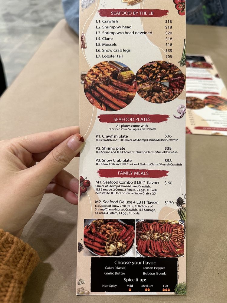 1 Lb. Snow crab included and 1 Lb. choice of shrimp w/ head, shrimp deveined, clams, mussel or crawfish.(Includes 1 Corn of cob, 1 Potato, and sausage)