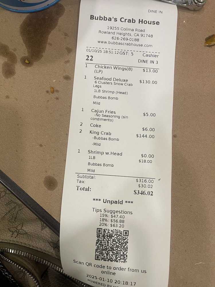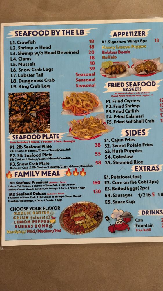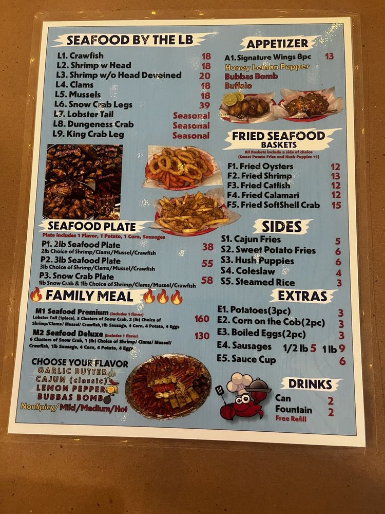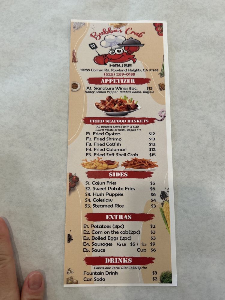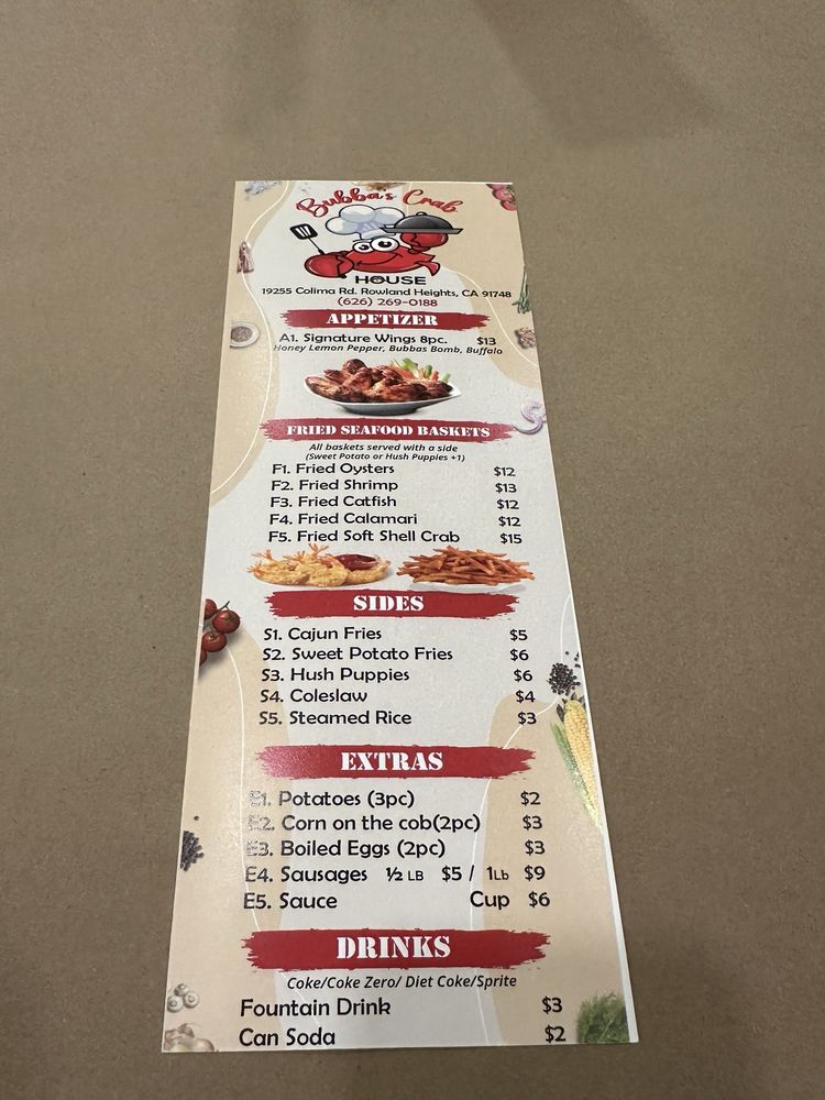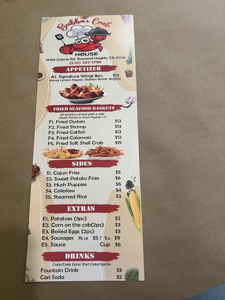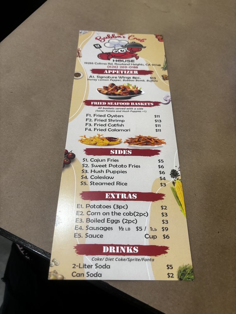 Introducing the menu at Bubbas Crab House, a Cajun/Creole seafood gem in Rowland Heights, CA, offers a delightful array of dishes. From the flavorful appetizers like honey lemon pepper wings to the satisfying fried seafood baskets (including fried oysters, shrimp, catfish, calamari, and soft shell crabs), the menu is a seafood lover's dream. Sides like Cajun fries, sweet potato fries, hush puppies, coleslaw, and steamed rice complement the main dishes perfectly. Customers rave about the generous portions, fresh seafood, and bold flavors. The service is top-notch, with attentive staff and a cozy ambiance, making it perfect for a casual night out or a group gathering. The menu items are reasonably priced, making it a great value for the quality and quantity of food. Don't miss out on the crowd favorites like the seafood boils, soft shell crab, and wings. Bubbas Crab House promises a memorable dining experience with every visit.
